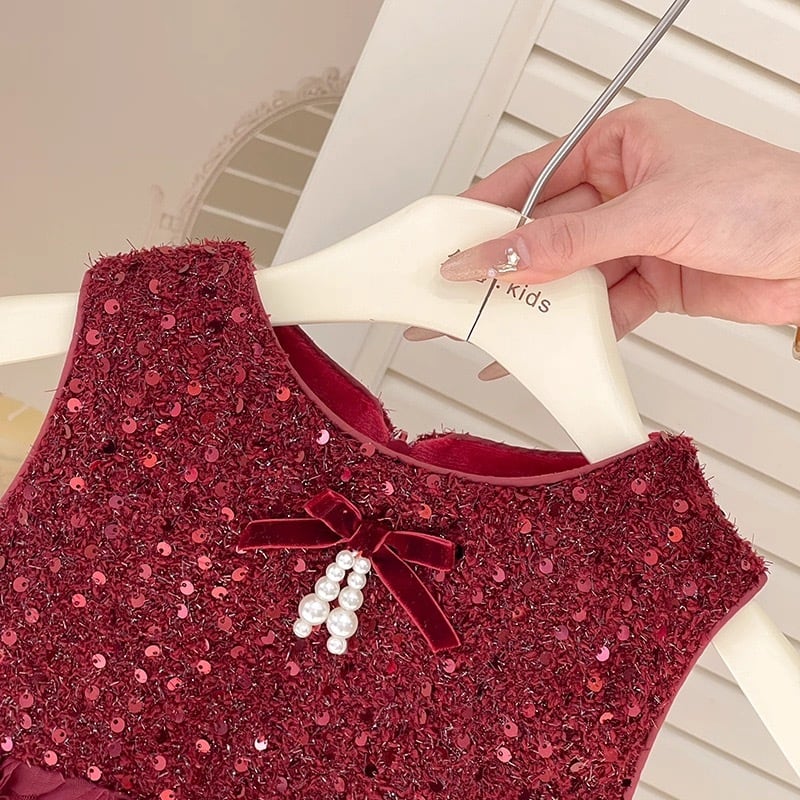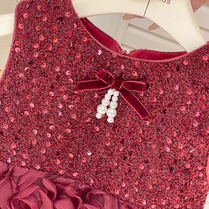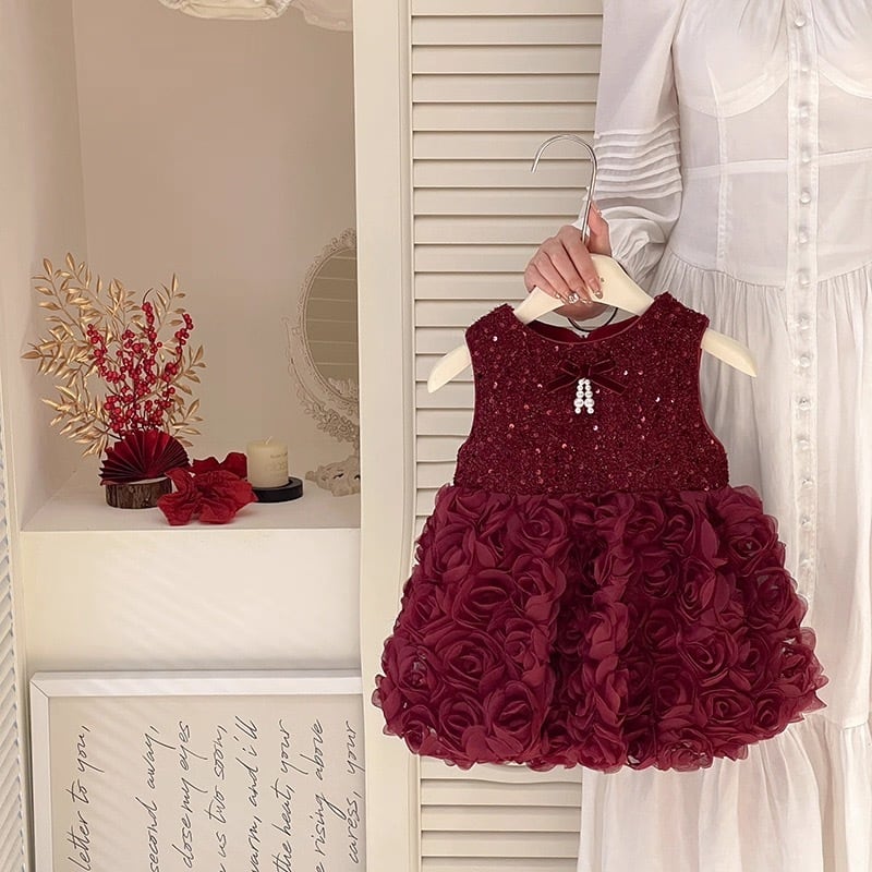 【90-140cm】フラワースカートスパンコールレッドワンピース【071007】