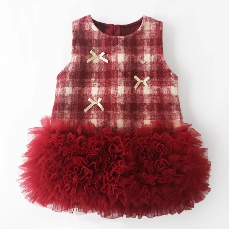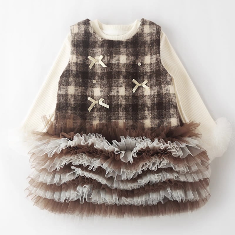 【90-130cm】全2色チェック柄裾チュールワンピース【071008】