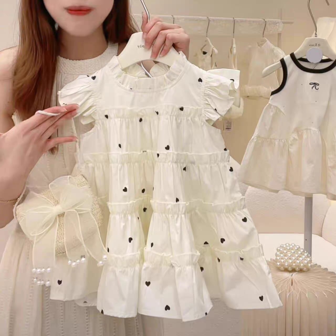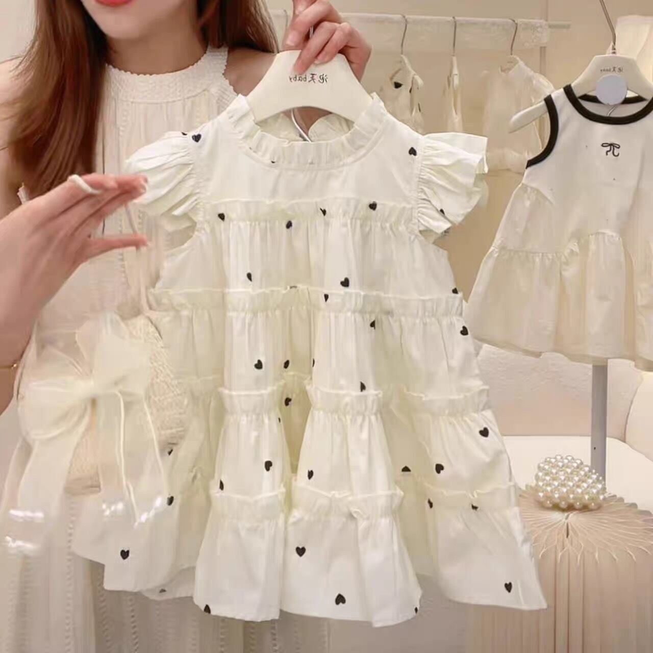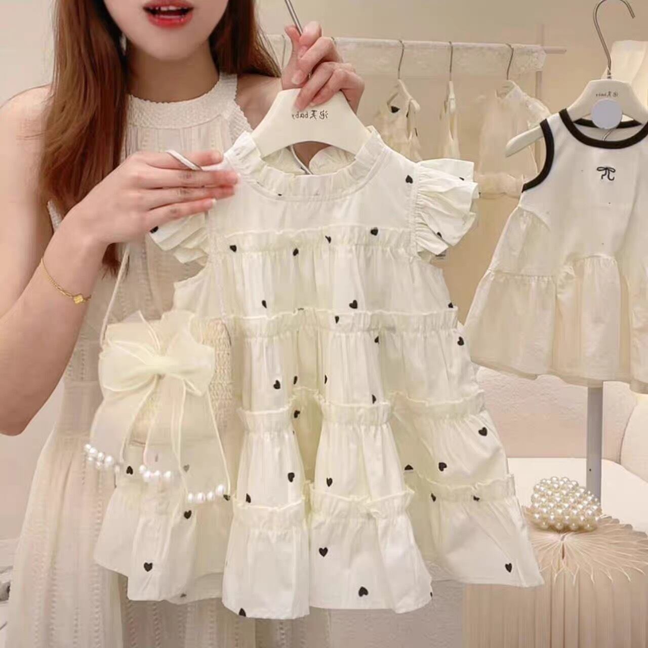 【新品】【90cm】【ホワイト】ハート柄ティアードワンピース