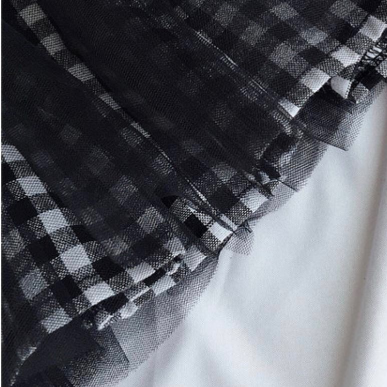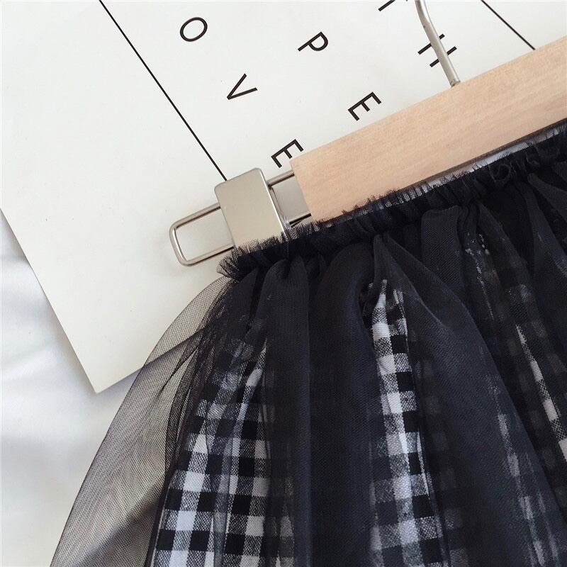長袖にきちんと感のある襟つきニットが上品で、2枚仕立てのチュールスカートはチュールの下にチェック柄が透けてとってもお洒落なデザインになっております♪