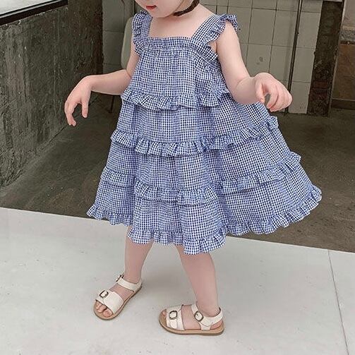 【80–130cm】ネイビーチェックフリルワンピース
