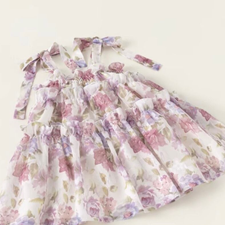 【80-140cm】花柄肩リボンティアードワンピース【050606】