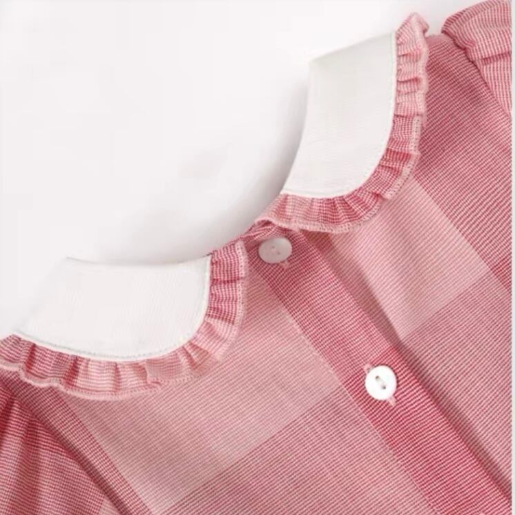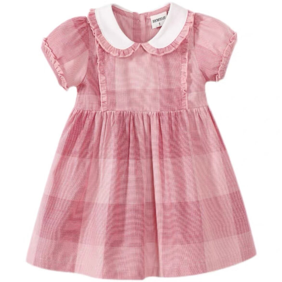【80-120cm】全2色襟付きパフスリーブチェック柄ワンピース